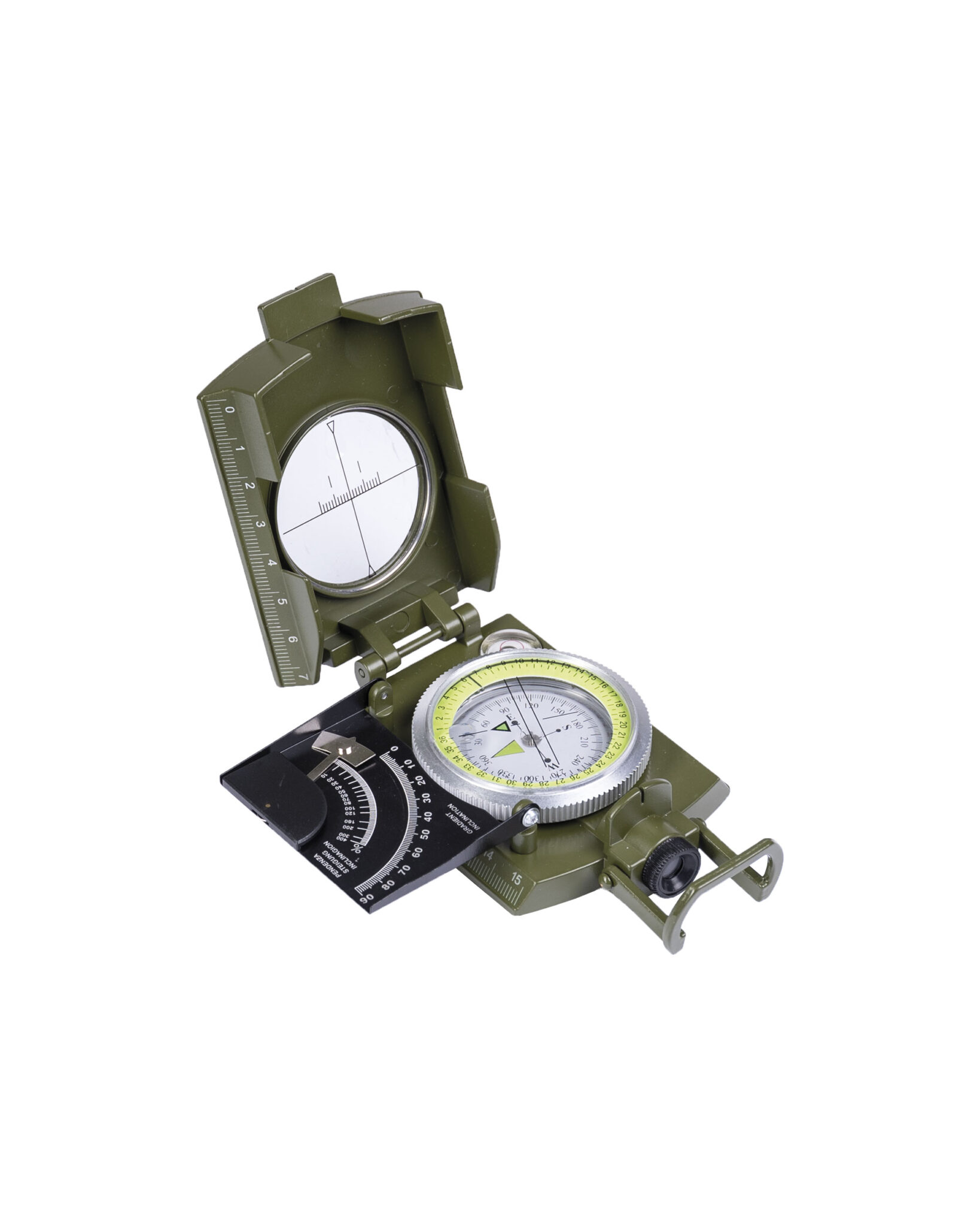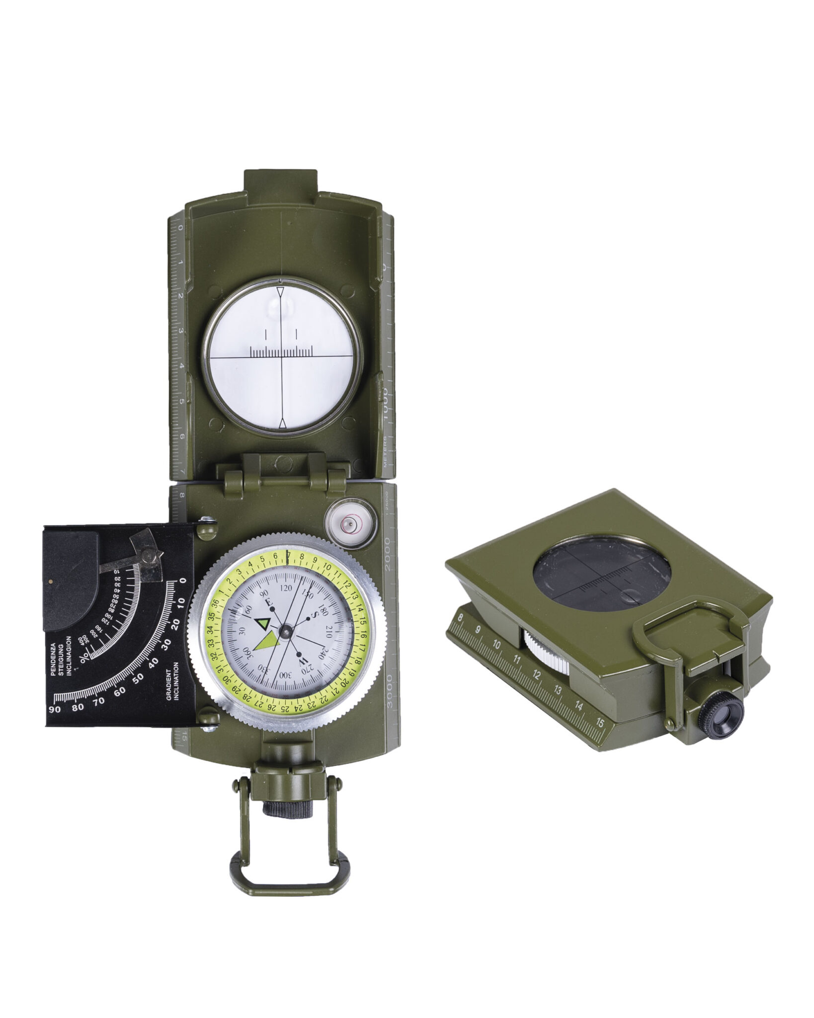 Stabilno metalno kućište, pohranjena tekućina, kontaktni rub s upravljanjem razmjerom 1: 25.000,nagib za mjerenje nagiba i visinske razlike, tražilo na vrhu, okretna skala